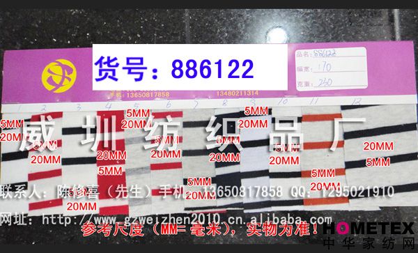 織物組織:色織 幅寬:170 密度:240T 貨號:886122 具體用途:襯衫、休閑服、棉服、褲裝、內衣、睡衣、時裝 別名:886122 成分及含量:滌棉 主要用途:服裝用布 紗支:32 ============================================================= 以上產品全部現貨供應,可隨時提供樣布卡和現貨,隨時發貨。所有產品全部是廠家直銷價,我們承諾:以超低利潤營銷,我們只求銷售量。為保證您的利益,我司建議您在采購前先確認我們的品質樣與顏色樣后再拿大貨,期待與您的真誠合作。因產品種類較多,具體參考未盡詳盡,如有需要,請您與我們聯系。 瑞豐紡織(中大旗艦店)坐落于國內最大的紡織面料產業中心—廣州中大,是一家專業銷售面料的廠家直銷商。主要經營產品有:全棉凈色、仿記憶絲面料、全棉(TC)色織等,面料品種花達上千余種,所有產品全部現貨經營。 我們面料的品質來源于:1、采用國內外優質的原材料;2、使用精良的生產工藝和設備;3、完善的生產質量管理體系。我們具有開發和創新品種的強烈意識和優越條件,并根據客戶需求與市場變化時時推出潮流面料。憑著多年的專業行業經驗,根據客戶需求,不論客戶在全國任何地方,只要提供小樣,就可在一兩天時間內輕松獲得所需面料的信息。 批發說明供應商支持混批 。 ============================================================= 有意請加QQ:1295021910或電話聯系。 公司名稱:威圳紡織品廠 聯系人:陳修喜先生 手機:13650817858 網址:http://www.gzweizhen2010.cn.alibaba.com =============================================================