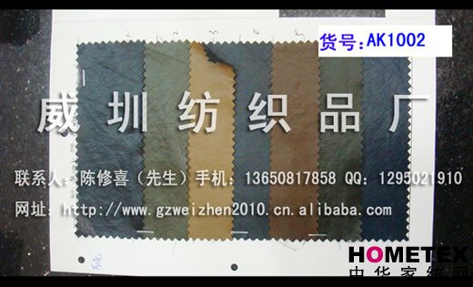 幅寬:140 別名:AK1002 厚度:0.8 主要用途:鞋、箱包、服裝、手套、家居、家具 品種:PU革 貨號:AK1002 ============================================================= 以上產品全部現貨供應,可隨時提供樣布卡和現貨,隨時發貨。所有產品全部是廠家直銷價,我們承諾:以超低利潤營銷,我們只求銷售量。為保證您的利益,我司建議您在采購前先確認我們的品質樣與顏色樣后再拿大貨,期待與您的真誠合作。因產品種類較多,具體參考未盡詳盡,如有需要,請您與我們聯系。 瑞豐紡織(中大旗艦店)坐落于國內最大的紡織面料產業中心—廣州中大,是一家專業銷售面料的廠家直銷商。主要經營產品有:全棉凈色、仿記憶絲面料、全棉(TC)色織等,面料品種花達上千余種,所有產品全部現貨經營。 我們面料的品質來源于:1、采用國內外優質的原材料;2、使用精良的生產工藝和設備;3、完善的生產質量管理體系。我們具有開發和創新品種的強烈意識和優越條件,并根據客戶需求與市場變化時時推出潮流面料。憑著多年的專業行業經驗,根據客戶需求,不論客戶在全國任何地方,只要提供小樣,就可在一兩天時間內輕松獲得所需面料的信息。 批發說明供應商支持混批 。 ============================================================= 有意請加QQ:1295021910或電話聯系。 公司名稱:威圳紡織品廠 聯系人:陳修喜先生 手機:13650817858 網址:http://www.gzweizhen2010.cn.alibaba.com =============================================================