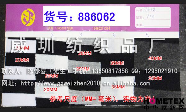 織物組織:色織 幅寬:170 密度:240T 貨號:886062 具體用途:襯衫、休閑服、褲裝、內衣、睡衣、時裝 成分及含量:滌棉 主要用途:服裝用布 紗支:32 ============================================================= 以上產品全部現貨供應,可隨時提供樣布卡和現貨,隨時發貨。所有產品全部是廠家直銷價,我們承諾:以超低利潤營銷,我們只求銷售量。為保證您的利益,我司建議您在采購前先確認我們的品質樣與顏色樣后再拿大貨,期待與您的真誠合作。因產品種類較多,具體參考未盡詳盡,如有需要,請您與我們聯系。 瑞豐紡織(中大旗艦店)坐落于國內最大的紡織面料產業中心—廣州中大,是一家專業銷售面料的廠家直銷商。主要經營產品有:全棉凈色、仿記憶絲面料、全棉(TC)色織等,面料品種花達上千余種,所有產品全部現貨經營。 我們面料的品質來源于:1、采用國內外優質的原材料;2、使用精良的生產工藝和設備;3、完善的生產質量管理體系。我們具有開發和創新品種的強烈意識和優越條件,并根據客戶需求與市場變化時時推出潮流面料。憑著多年的專業行業經驗,根據客戶需求,不論客戶在全國任何地方,只要提供小樣,就可在一兩天時間內輕松獲得所需面料的信息。 批發說明供應商支持混批 。 ============================================================= 有意請加QQ:1295021910或電話聯系。 公司名稱:威圳紡織品廠 聯系人:陳修喜先生 手機:13650817858 網址:http://www.gzweizhen2010.cn.alibaba.com =============================================================