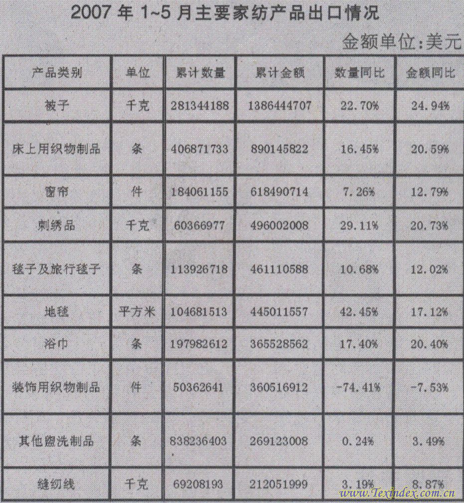 據(jù)海關(guān)統(tǒng)計(jì),2007年1~5月家紡產(chǎn)品出口75.98億美元,同比增長11.58%。進(jìn)口5.18億美元,·同比增長1.33%。主要呈現(xiàn)以下特點(diǎn):