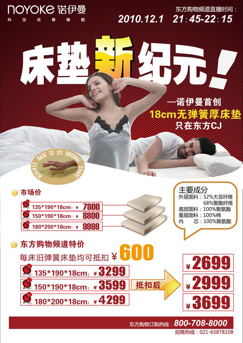 活動內容:史無前例!諾伊曼豪華超厚記憶床墊4折起,另外,每床舊彈簧床墊均可抵扣600元!!!諾伊曼為你送上冬日里的無限溫暖!超值特惠,只在東方CJ,僅限一小時!還等什么,快快搶購吧!產品明細:品名尺寸現價原價抵扣價諾伊曼豪華零壓力床墊135*190*18CM329978002699150*190*1...[繼續閱讀]