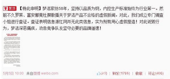 富安娜家紡就昨日夢潔家紡官方發布會指責“富安娜家紡與羅萊家紡捏造假新聞詆毀”事件作出回應,并于官方微博與騰訊微信等平臺提出“嚴重聲明”表明自己的清白立場,并欲追究相關責任。以下為富安娜官方微博聲明內容:...[繼續閱讀]